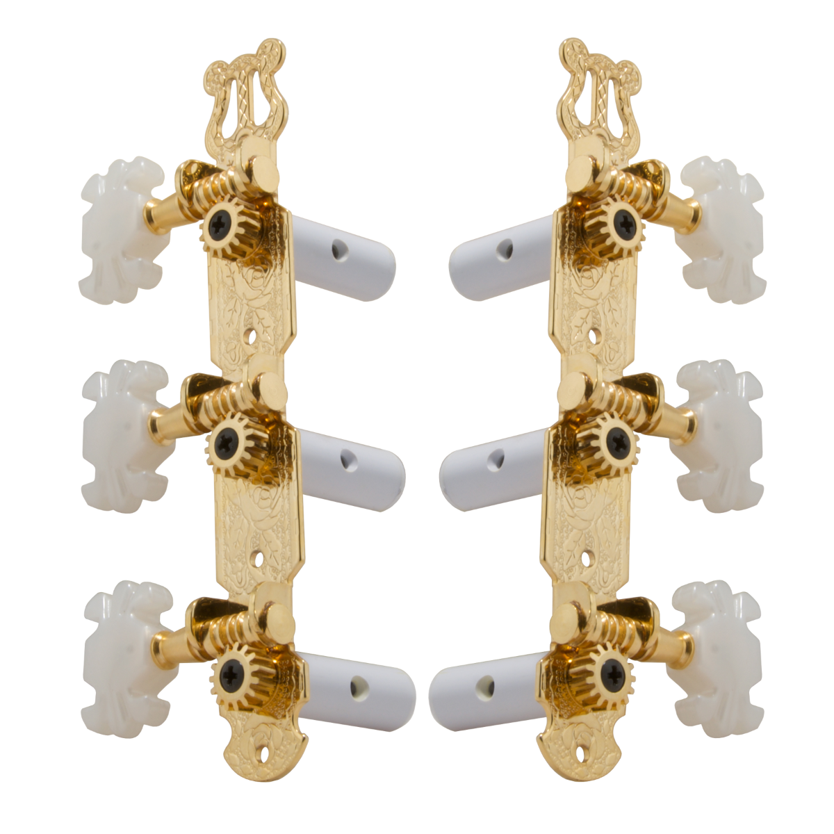 Traditional Grover® quality and craftsmanship. Beautifully engraved plates. Three on a plate. Butterfly style, pearloid buttons, plastic coated string posts. Includes screws. With a 14:1 gear ratio.