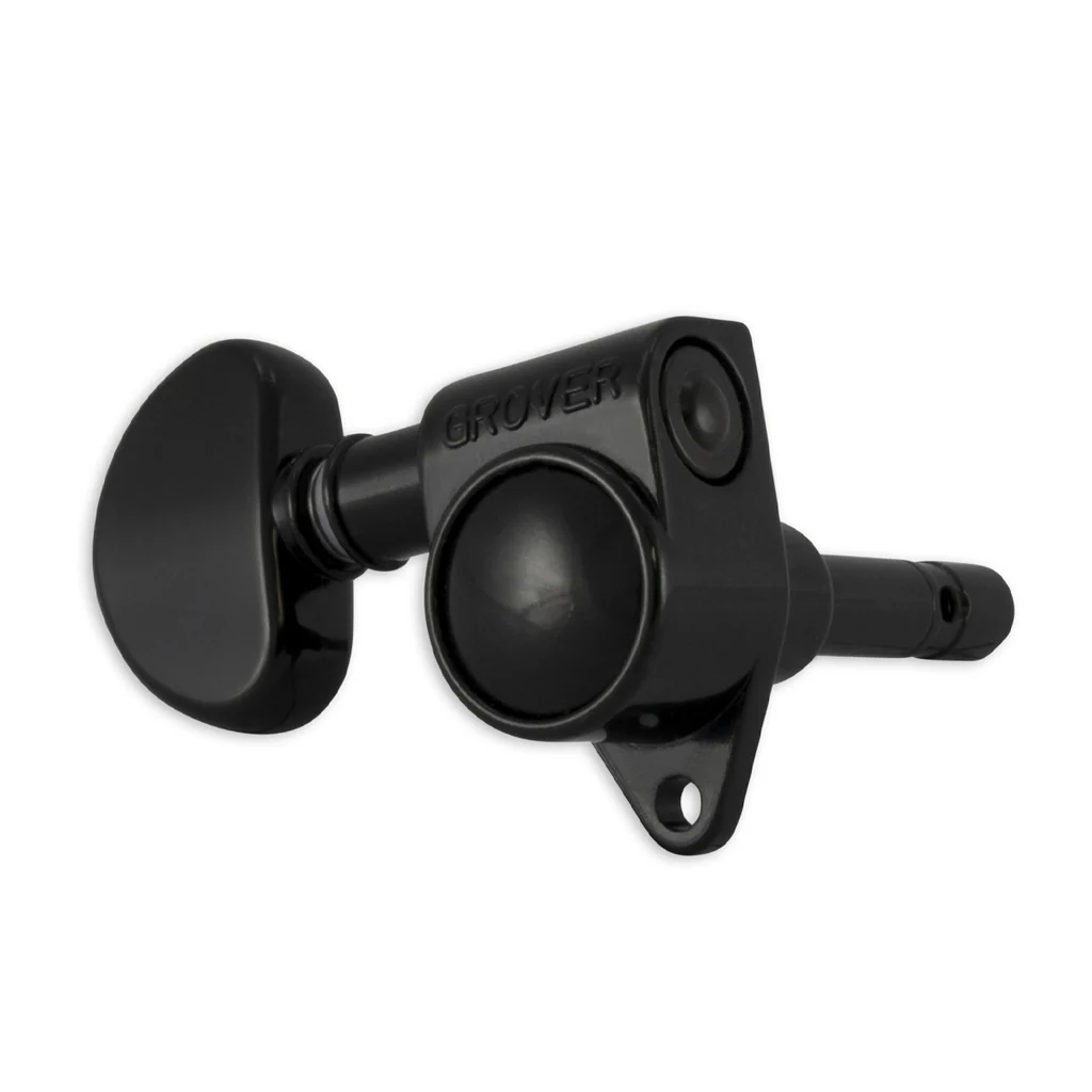 Grover Locking Rotomatics® give you the ease of use provided by a standard tuner and the positive locking of our internal cam post. Simply insert the string through the string hole, pull to tension by hand and begin tuning. As you start to tune, only the locking cam in the string post turns. Once the string is locked, the string post begins to turn allowing you to bring the string to pitch. In less then one revolution of the string post, you will be in tune, to stay in tune. Gear ratio is 18:1.