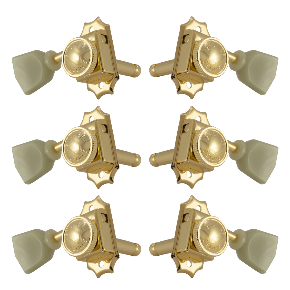 Mechanically engineered to the most precise standards of excellence, with the classic look of vintage styling, Grover’s Vintage 533 locking series come with a “thumb screw” mechanism, which locks the string into place. Insert the string through the post hole, wrap around once, then lock by tightening with the thumb screw. Worm and gear are cut to mesh perfectly, thereby eliminating backlash and slippage. The housings are self-lubricating for a lifetime of trouble-free service. 15:1 gear ratio.