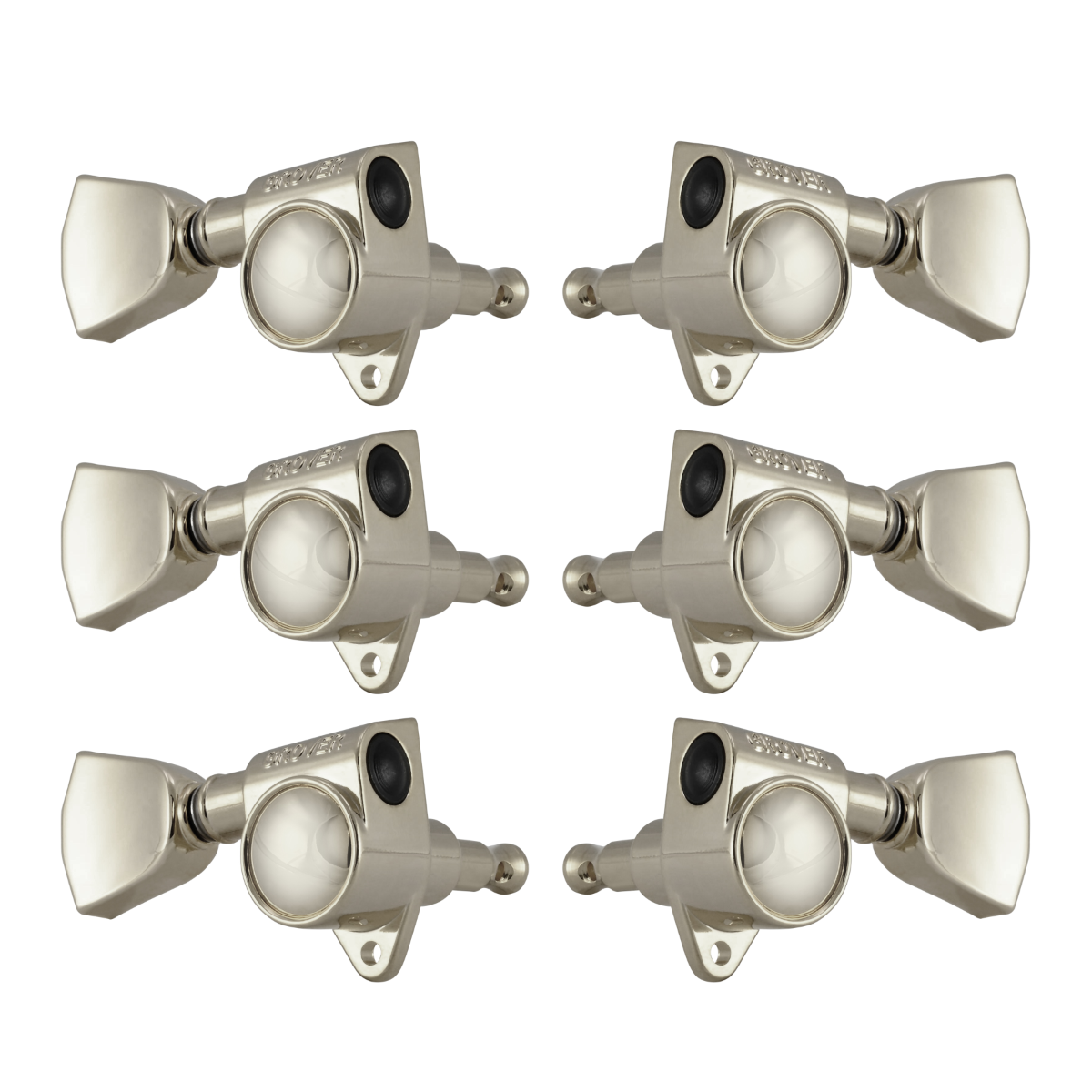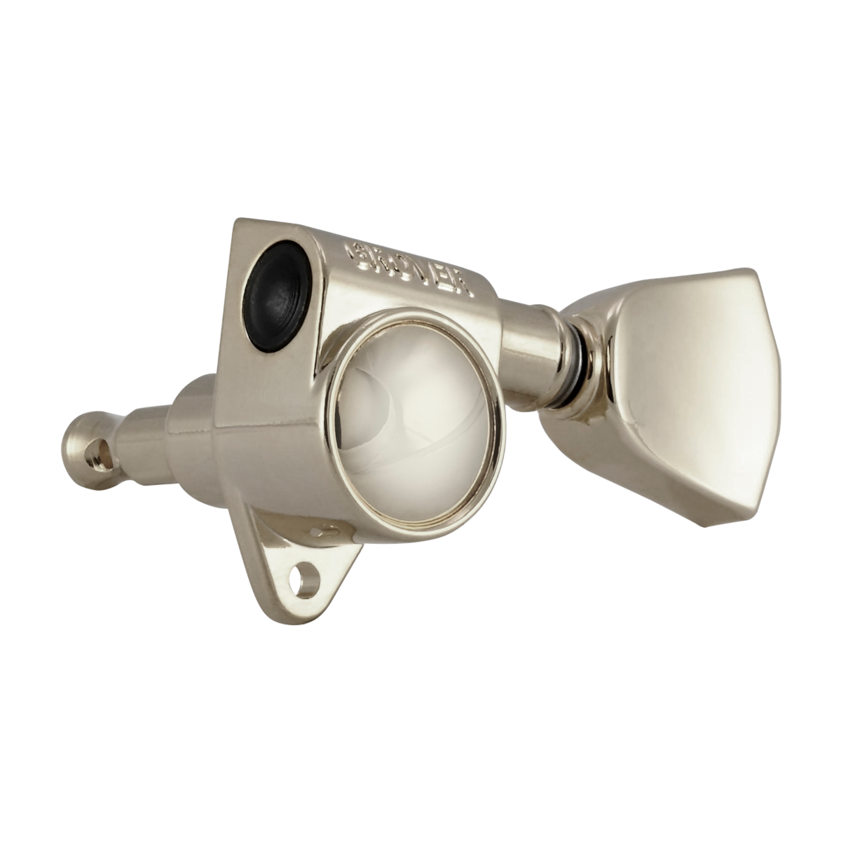 These guitar machines are a triumph in engineering and styling. The housing provides a maximum bearing for worm, gear and string post. Gear ratio is 14:1. Worm and gear are precision-cut for perfect meshing. This eliminates backlash and slippage. Countersunk tension screw permits player to regulate turning tension to any degree. Gear box has a special lubricant for lifetime, trouble-free service. Includes 5/8” washers, bushings and wood screws.