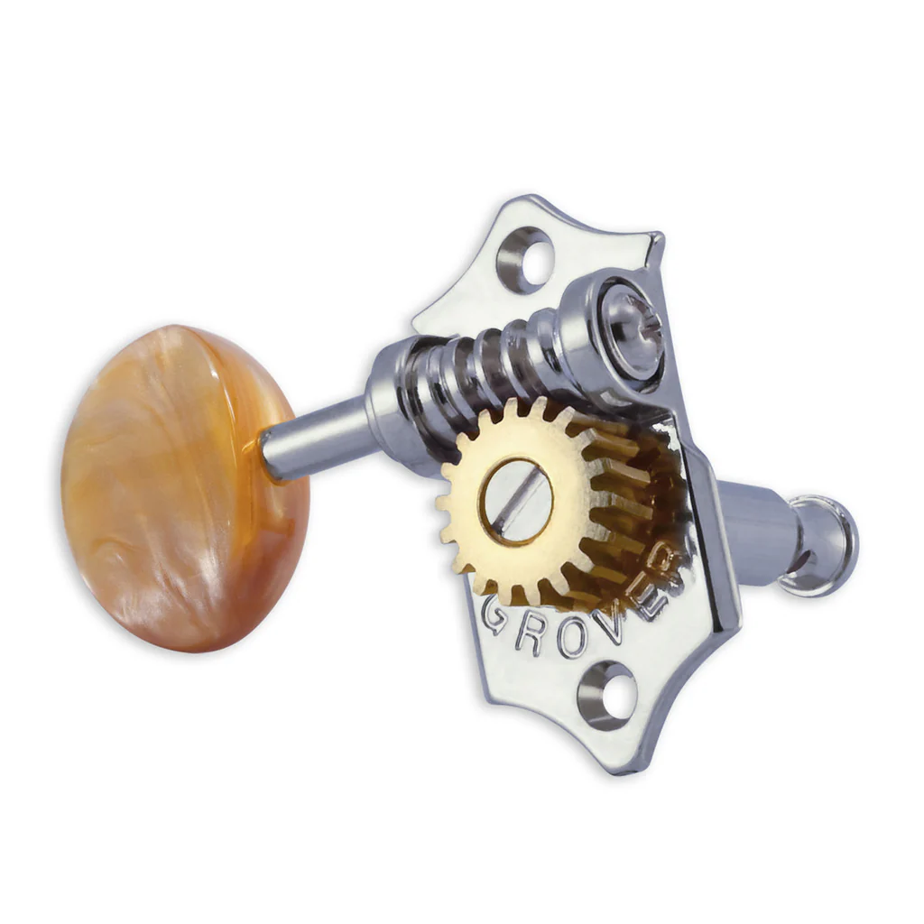The 18:1 gear ratio Grover® Sta-Tite™ machine head. The classic styling of the Sta-Tite™ returns with the Grover® name. The butter bean button identifies this as the original. A 18:1 gear ratio provides precise tuning. Wood screws, washers, and bushings included.