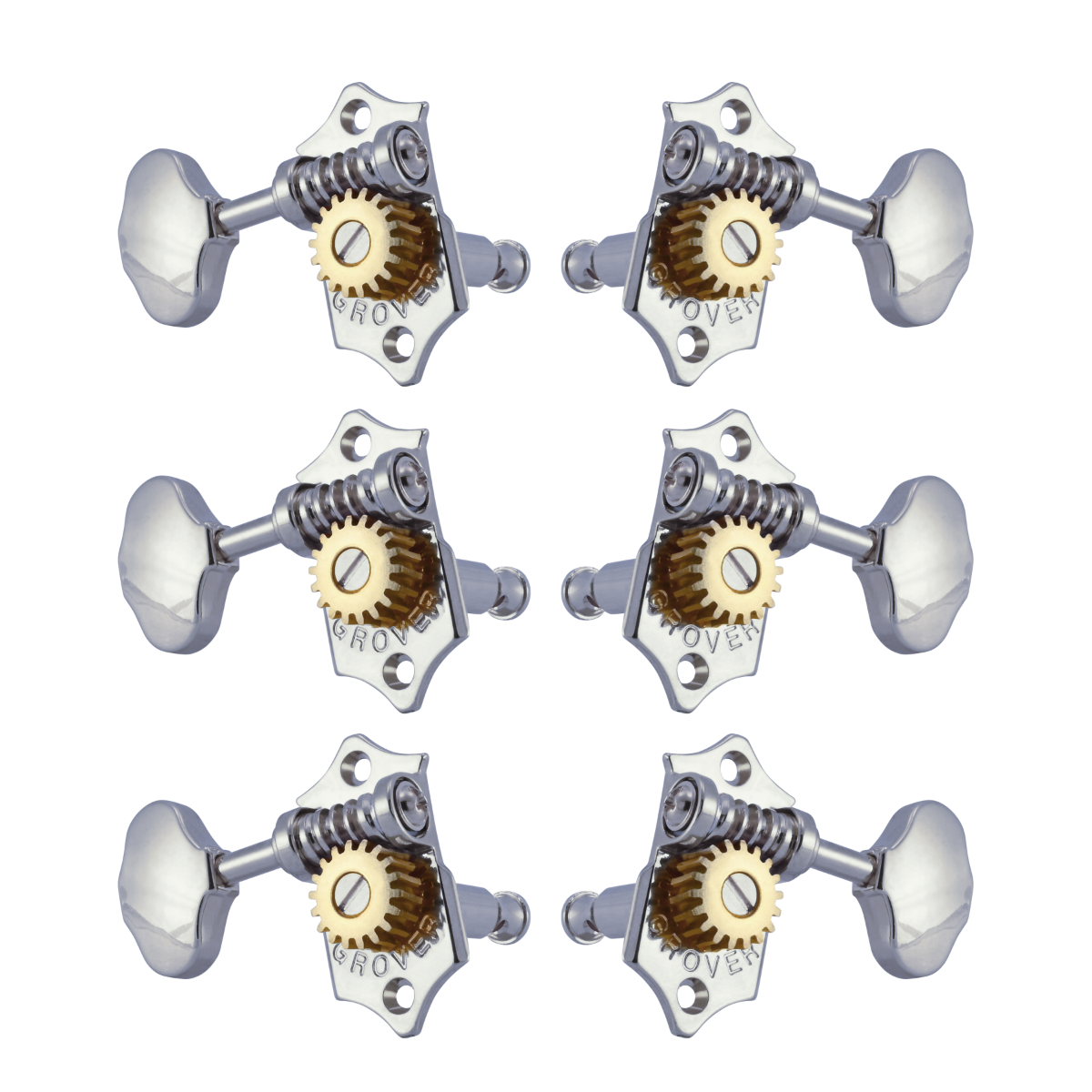 The 18:1 gear ratio Grover® Sta-Tite™ machine head. The classic styling of the Sta-Tite™ returns with the Grover® name. The butter bean button identifies this as the original. A 18:1 gear ratio provides precise tuning. Wood screws, washers, and bushings included.