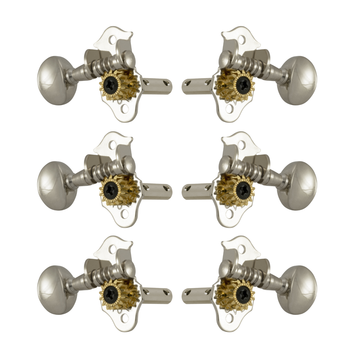 Beautiful machine heads with the classic round button, the 98 Series provides smooth, sure tuning. Heavily plated finish with a striking contrast to the brass gears. Screws and bushing included. With a 14:1 gear ratio.