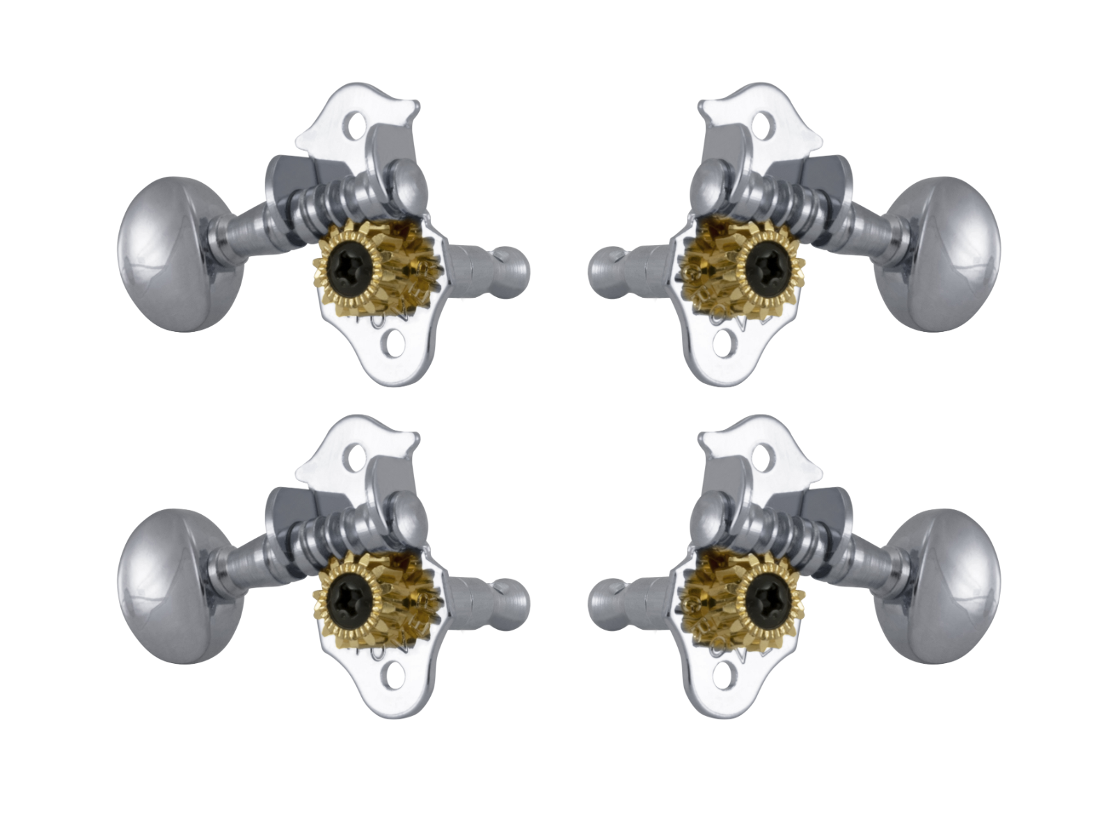 The one-piece back plate, brass gear, die cast button and knurled bushings are the same as those used on the Sta-Tite™ guitar machine head. The string post has been shortened to 1 inch with the string hole .775” from the back of the base. 14:1 gear ratio provides for accurate tuning. Includes bushings and wood screws.