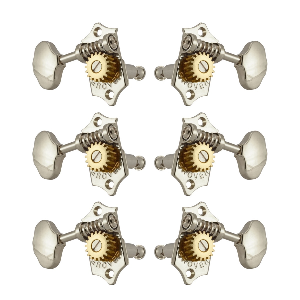 The 18:1 gear ratio Grover® Sta-Tite™ machine head. The classic styling of the Sta-Tite™ returns with the Grover® name. The butter bean button identifies this as the original. A 18:1 gear ratio provides precise tuning. Wood screws, washers, and bushings included.