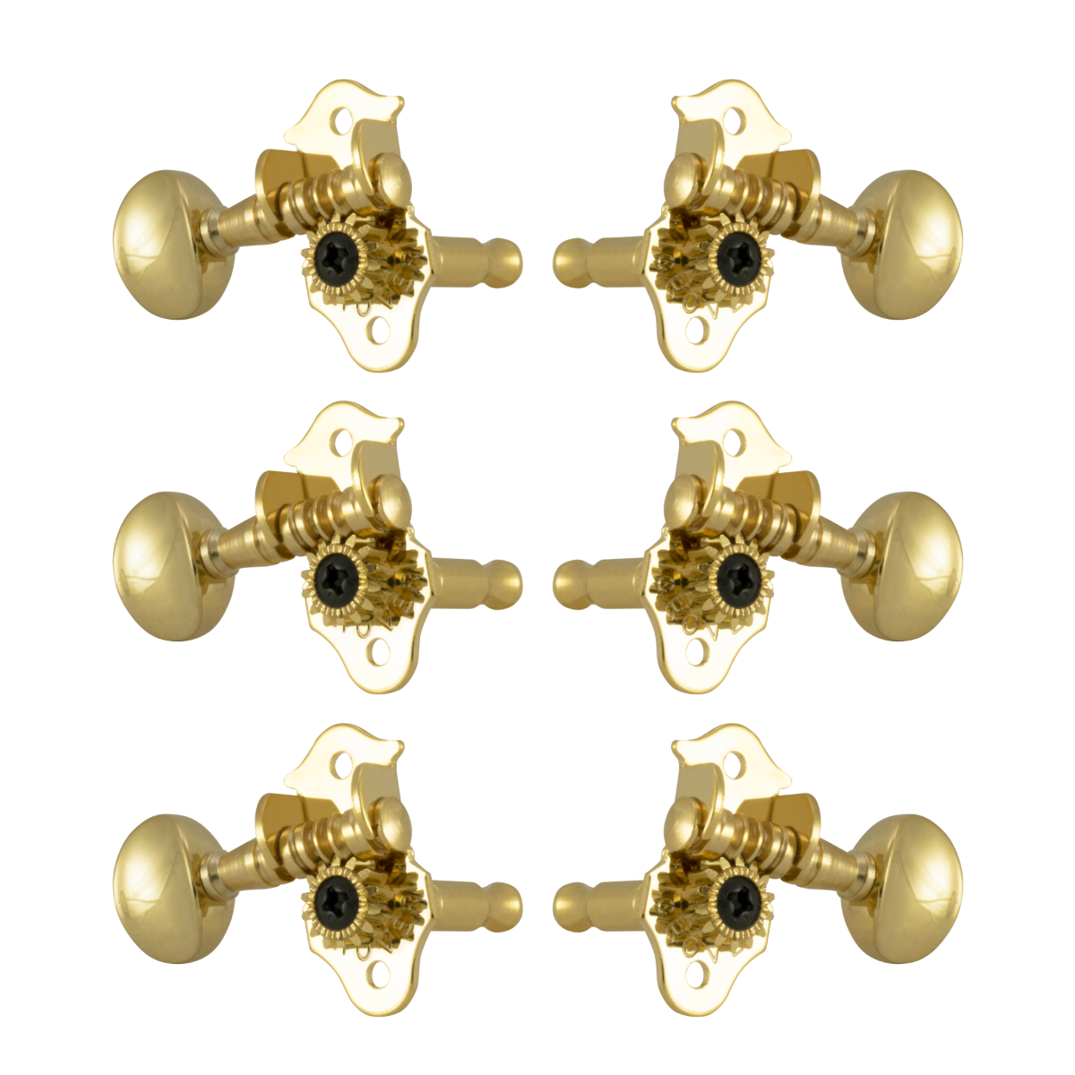 Beautiful machine heads with the classic round button, the 98 Series provides smooth, sure tuning. Heavily plated finish with a striking contrast to the brass gears. Screws and bushing included. With a 14:1 gear ratio.