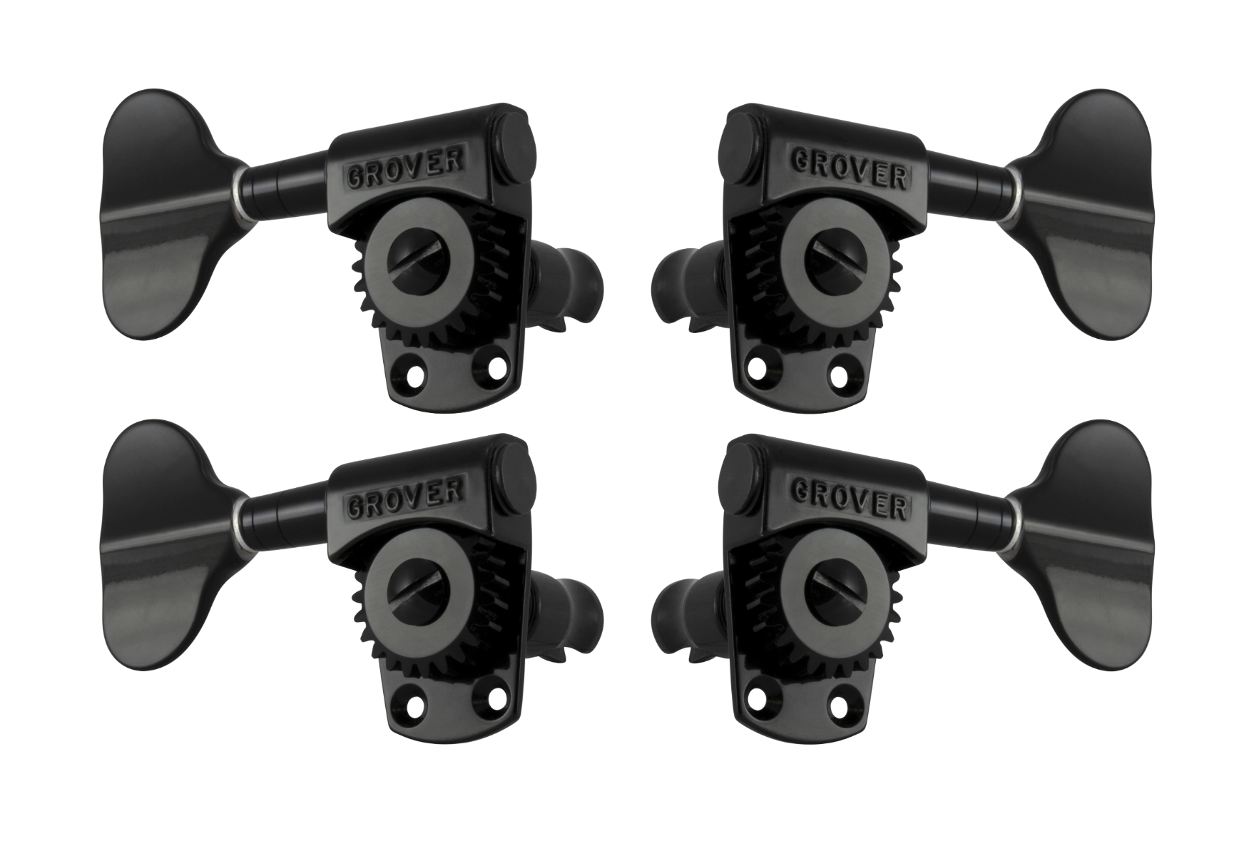 SELF ALIGNING THRUST BEARINGS! Gear ratio is 20:1. Special butterfly button. Durable cast housing. End thrust bearings. Worm meshes perfectly with gear. Safety-type string posts with cutaway shoulders to provide slip-over. Two screws in housing apron provide greater holding power. May be used with ALL modern bass guitar headpieces. Individually hand tested. Screws and bushings included.
