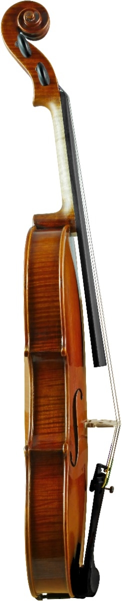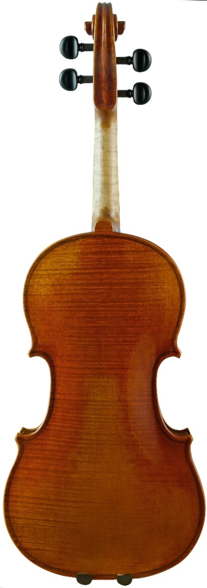 The finely grained spruce top and one-piece maple back reflect Stradivari’s hallmark craftsmanship, enhanced by a hand-applied oil varnish that reveals a warm golden-amber glow and delicate horizontal flame. Inspired by the Cremonese model, the design balances graceful contours with precise arching to deliver both visual and tonal sophistication.