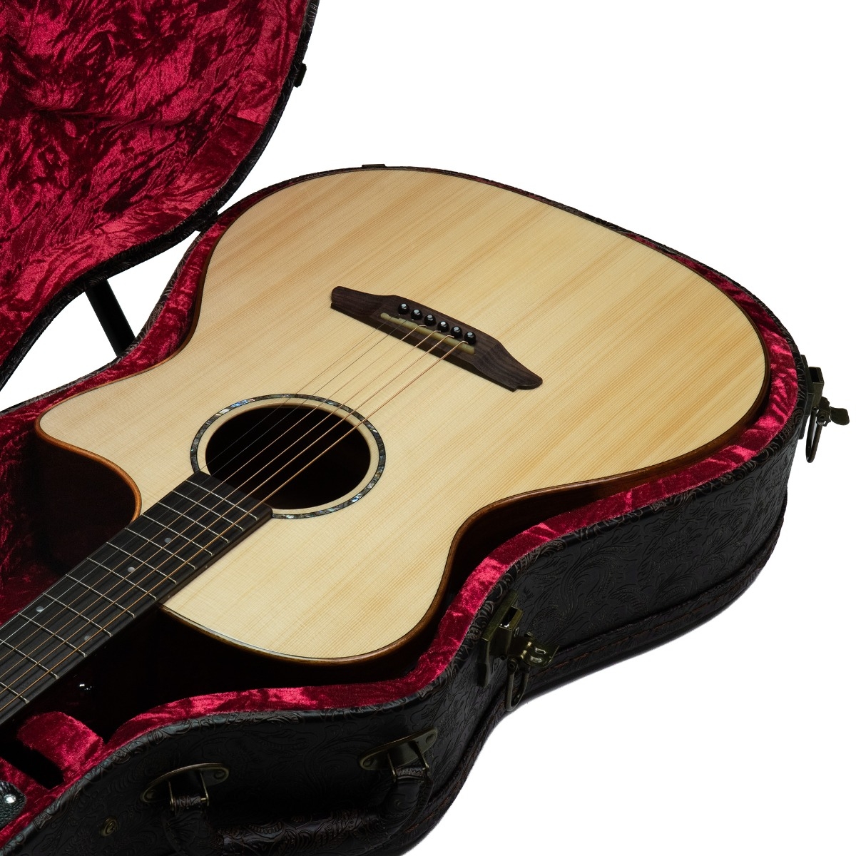 Inside, a luxuriously soft plush velvet lining gently cradles your instrument, cushioning it from impact while preventing scratches or movement in transit. A shaped interior supports the neck and body, ensuring your guitar stays perfectly positioned.