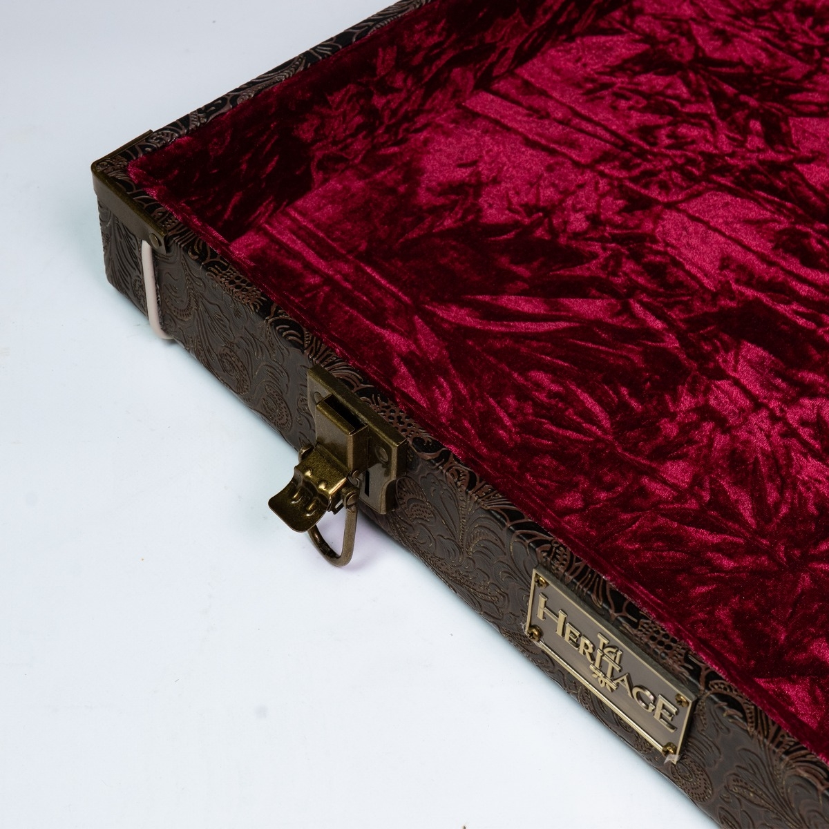 Visually, the Heritage case stands apart. The exterior is wrapped in an ornate embossed faux leather finish, featuring a detailed floral/petal pattern that evokes classic vintage luggage aesthetics. Antique Gold-tone hardware - including secure latches and a locking clasp - adds both visual sophistication and practical security.